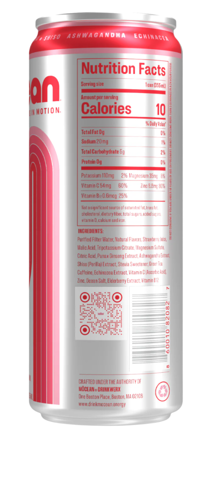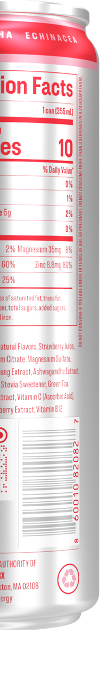 Purified Filtered Water, Natural Flavors, Citric Acid, Organic Green Tea Caffeine, Magnesium Citrate, Shiso (Perilla) Extract, Echinacea Extract, Panax Ginseng Extract, Vitamin C (Ascorbic Acid), Ocean Salt, Stevia Sweetener, Elderberry Extract, Zinc, Vitamin B12